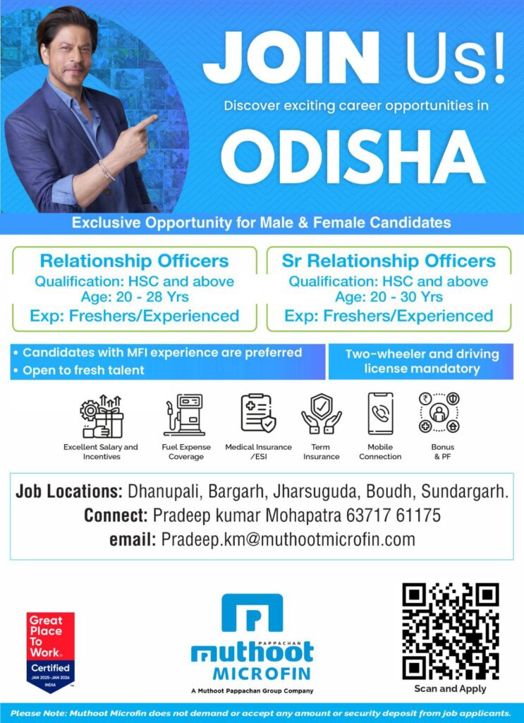 Muthoot Microfin Ltd. is hiring Relationship Officers and Senior Relationship Officers across various locations in Odisha — Sambalpur, Bargarh, Boudh, and Sundargarh.