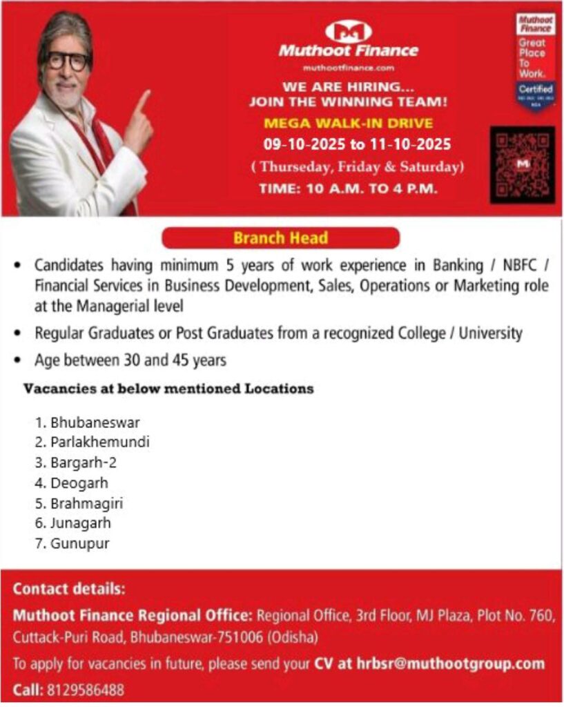 Mutooth finance hiring branch in bhubaneswar ,Paralakhemundi,Bargarh-2,Deogarh,Brahmagiri,Junagarh,Gunupur Mega walk in drive conducting between 09/10/2025 to 10/10/2025 for Managerial Post in different of location of odisha.