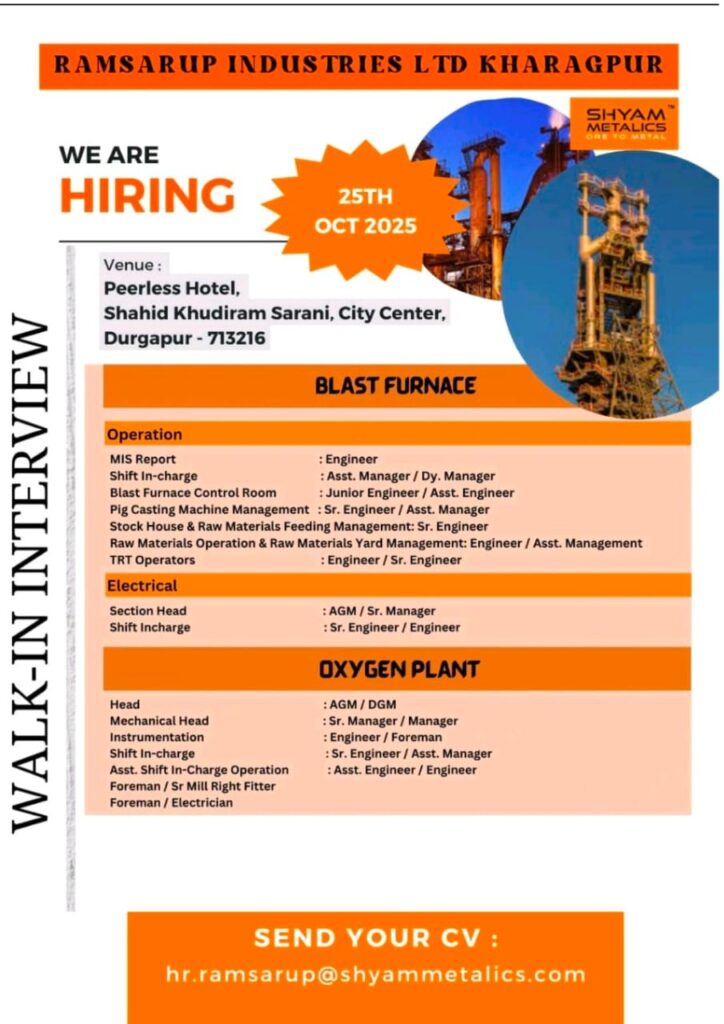 Ramsarup Industries Ltd Kharagpur Walk-In Interview 2025: Apply for Engineer and Various Posts on 25th October